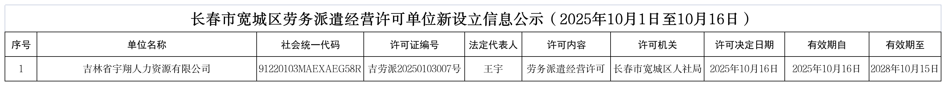 lol下注 劳务派遣经营许可单位新设立信息公示(2025年10月1日至10月16日)