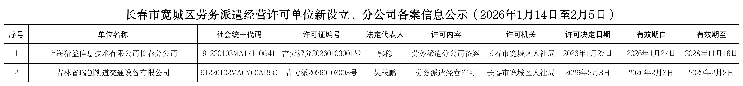 lol下注 劳务派遣经营许可单位新设立、分公司备案信息公示(2026年1月14日至2月5日)