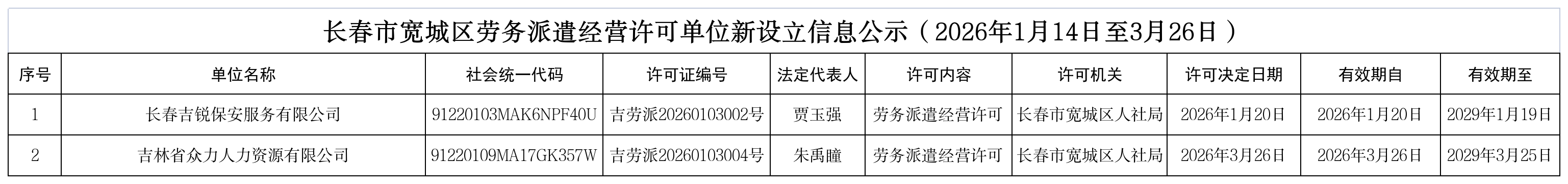 lol下注 劳务派遣经营许可单位新设立信息公示(2026年1月14日至3月26日)