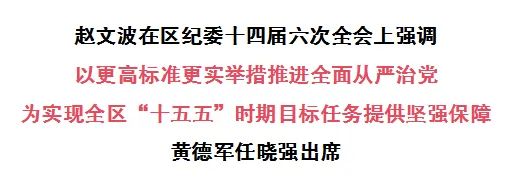 第十四届纪律检查委员会第六次全体会议召开。区委书记赵文波出席会议并讲话。区人大常委会主任黄德军,区政协主席任晓强出席会议。
