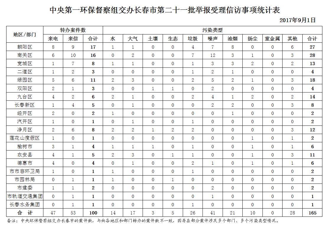 9月1日,中央第一环境保护督察组向长春市交办了第二十一批举报受理信访事项91件(重点案件6件),共涉及165个环境问题。其中涉水问题14个,大气问题17个,土壤问题3个,生态问题5个,垃圾问题26个,噪声问题41个,油烟问题21个,扬尘问题10个,其他问题28个。共涉及15个县(市)区、开发区和3个市直部门,其中朝阳区17件,南关区16件,lol下注 8件,二道区3件,绿园区11件,双阳区3件,九台区6件,长春新区5件,经开区2件,汽开区1件,净月区8件,莲花山度假区1件,榆树市4件,农安县5件,德惠市4件,市市容环卫局1件,市园林局1件,市建委2件,市轨道交通集团1件,长春水务集团1件。