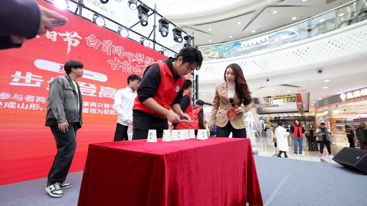 文艺表演展现风采,传统游戏激活文化:吉林大学清逸中国舞社团表演的《茶花开了》婀娜多姿,歌曲《草原夜色美》《呼伦贝尔大草原》悠扬动听,展现了新时代老年人积极乐观的精神风貌。“步步登高”和“重阳木射”传统游戏互动环节,巧妙将民俗与趣味结合,吸引各年龄段市民踊跃参与。木射游戏起源于唐代,蕴含着古人“以礼正身”的智慧,活动现场设置红黑十五根木柱,在每根木柱上用红黑颜色各写一字,红的为“仁、义、礼、智、信”等美德,黑的为“傲、慢”等不良习性。参与者用木球滚射木柱,命中红字者赢得好彩头。这一古老游戏不仅带来欢乐,更让参与者在互动中接受传统美德的熏陶。