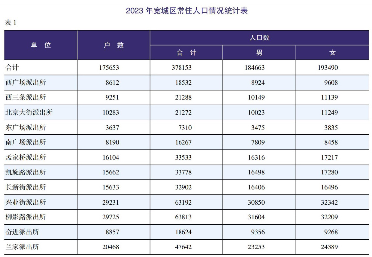 不含长春市有关开发区和德惠市、农安县代管的街道、镇,实际户籍总人口175653户、378153人。其中,男性人口184663人、女性人口193490人,男性和女性人口分别占户籍总人口的48.83%、51.17%;乡村户籍人口3.95万人。全区人口出生率3.62‰,死亡率1.47‰,自然增长率2.15‰。