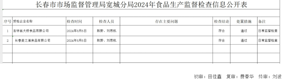 长春市市场监督管理局宽城分局2024年食品生产监督检查信息公开表