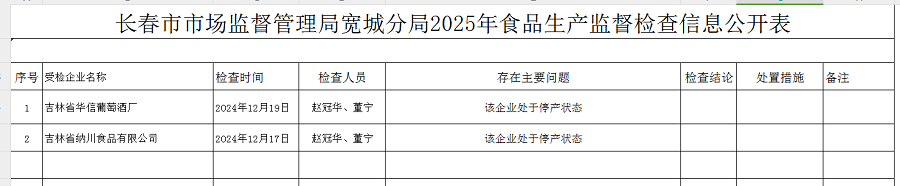 长春市市场监督管理局宽城分局2025年食品生产监督检查信息公开表