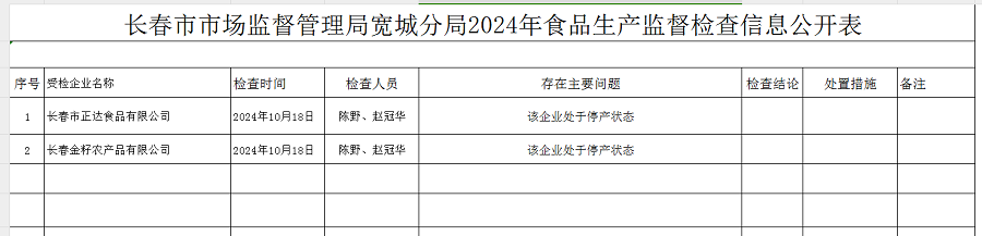 长春市市场监督管理局宽城分局2024年食品生产监督检查信息公开表