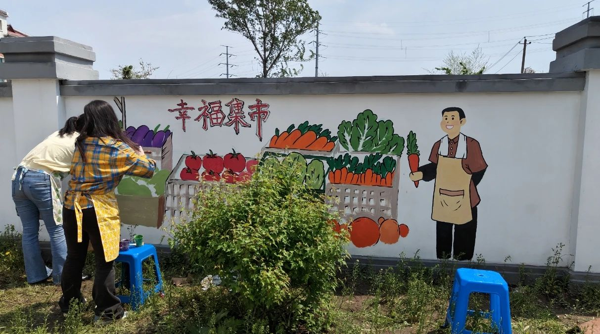 活动现场,青年志愿者们充分发挥自身专业特长,拿起画笔和颜料,化身“社区美化师”,为幸福集市绘制墙面彩绘。粉刷、调色、勾线、涂绘……经过精心设计和用心描绘,一幅幅栩栩如生的集市场景和憨态可掬的水果蔬菜跃然墙上,让幸福集市充满了浓浓的“烟火气”。